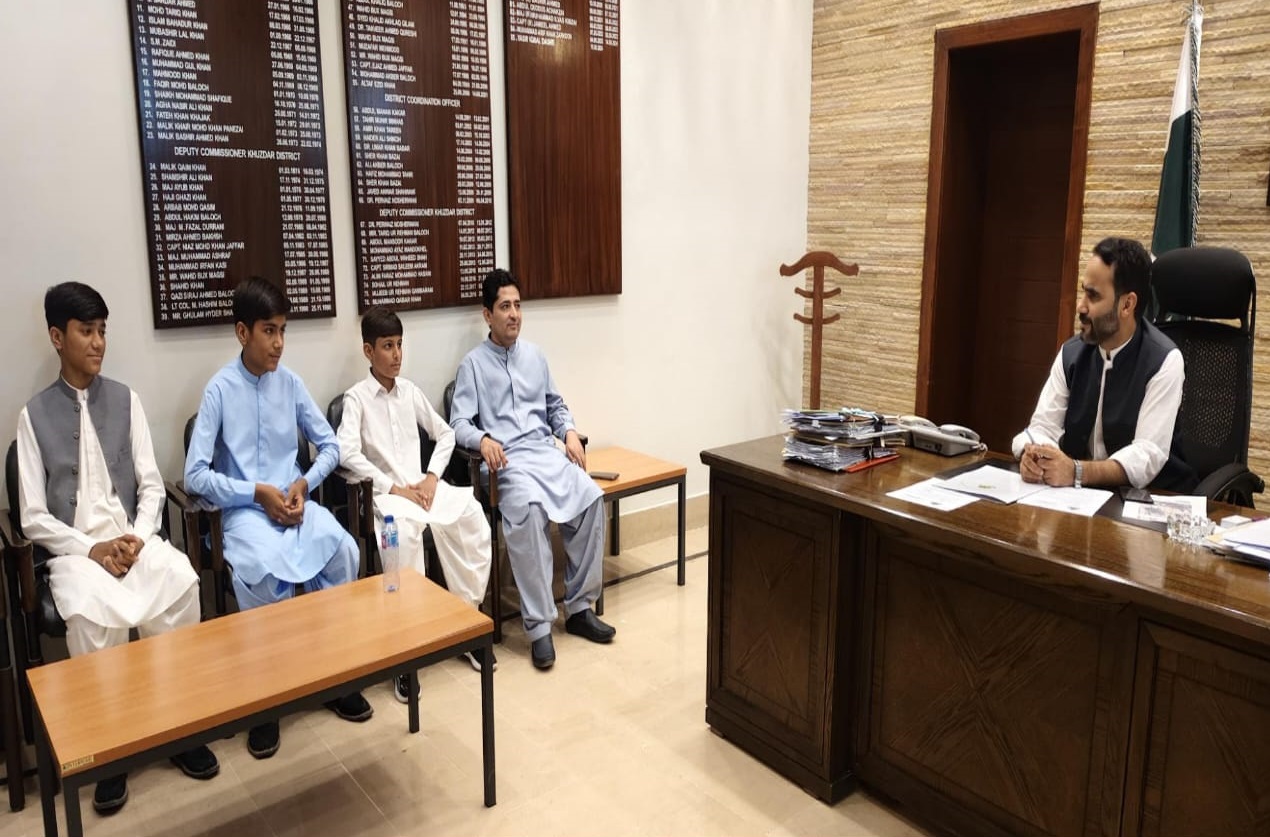 خضدار1یکم اگست .۔ڈپٹی کمشنر خضدار یاسر اقبال دشتی سے کیڈیٹ کالج نوشکی میں داخلہ حاصل کرنے والے طلباء سنان بلوچ، زاکر بلوچ اور عزیر احمد نے ملاقات کی۔ اس موقع پر ڈپٹی کمشنر نے طلبائ کو ان کی شاندار کامیابی پر مبارکباد پیش کی اور انہیں خراج تحسین پیش کیا۔یاسر اقبال دشتی نے کہا کہ ضلع خضدار کے طلبائ کا کیڈیٹ کالج نوشکی جیسے اعلیٰ تعلیمی ادارے میں داخلہ حاصل کرنا نے اپنے تعلیمی عزائم اور مستقبل کے مقاصد کے بارے میں ڈپٹی کمشنر سے گفتگو کی۔اس ملاقات سے سنان، زاکر اور عزیر سمیت دیگر طلبائ کے جذبے اور حوصلے میں مذید اضافہ کیا. ۔