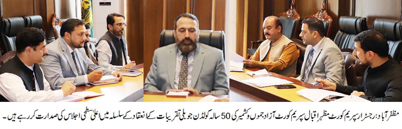 رجسٹرار سپریم کورٹ مظہر اقبال کی سربراہی میں سپریم کورٹ کے آفیسران کا انتہائی اہم اجلاس کمیٹی روم نمبر 1 میں منعقد ہوا۔ اجلاس میں ڈپٹی رجسٹرار سپریم کورٹ سید فیضان حیدر، سیکرٹری ٹو چیف جسٹس خواجہ محمد شوکت، نثار شاہین اسسٹنٹ رجسٹرار، سٹاف آفیسر تیمور ممتاز، پروٹوکول آفیسر تیمور درانی کے علاوہ دیگر آٖفیسران نے شرکت کی۔ اجلاس میں سپریم کورٹ آزاد جموں و کشمیر کے قیام کی گولڈن جوبلی تقریبات کے دوبارہ انعقاد اور انتظامات کے حوالے سے اہم مشاورت کی گئی اور اس سلسلہ میں مجوزہ تقریبات اور جوڈیشل کانفرنس کےستمبر 2025 تک دوبارہ انعقاد کے سلسلہ میں ضروری انتظامات کا جائزہ لیا گیا ۔ یاد رہے کہ مؤرخہ 10 مئی 2025 کو سپریم کورٹ آزاد جموں و کشمیر کے قیام کو 50 سال مکمل ہو چکے ہیں اور اس موقع پر گولڈن جوبلی تقریبات اور جوڈیشل کانفرنس مؤرخہ 8 تا 10 مئی 2025 کو منعقد ہو رہی تھی اور پروگرام حتمی ہو چکا تھا لیکن 6 تا 10 مئی کو پاکستان کے خلاف بھارتی جارحیت کی وجہ سے پیش آمدہ غیر معمولی صورتحال کے پیش نظر گولڈن جوبلی تقریبات کو ملتوی کر دیا گیا تھا۔ اجلاس میں طے ہوا کہ بہت جلدی گولڈن جوبلی تقریبات اور جوڈیشل کانفرنس کے دوبارہ انعقاد کے لئے حتمی تاریخوں کا اعلان کر دیا جائے گا۔