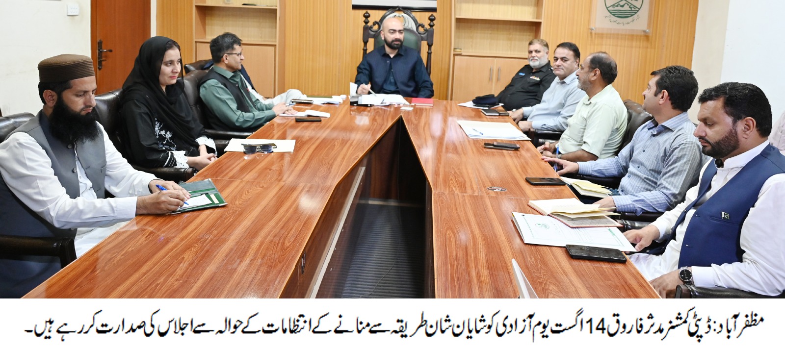 ڈپٹی کمشنر مدثر فاروق کی زیر صدارت14 اگست 2025”یوم آزادی پاکستان ومعرکہ حق“ کو شایان شان طریقے سے منائے جانے کے حوالہ سے منعقد کی جانے والی تقاریب کو حتمی شکل دینے کیلئے ایک اجلاس منعقد ہوا۔اجلاس میں مجسٹریٹ صاحبان،پولیس آفیسران اورضلعی آفیسران دیگر محکمہ جات نے شرکت کی۔اس موقع پر ڈپٹی کمشنر مظفرآباد نے کہا کہ قیام پاکستان کے سلسلہ میں مسلمانوں کی طویل جدوجہداورقربانیوں کو خراج عقیدت پیش کرنے،شہداء کے ایصال ثواب اورحاصل ہونے والی آزادی کی نعمت پرشکرگزاری کے سلسلہ میں ضلع ہذامیں تقاریب کاانعقادکیاجارہا ہے۔نماز فجر کے بعد ضلع ہذا کی تمام مساجد/مدارس میں پاکستان وآزادریاست جموں وکشمیر کی خوشحالی اور مقبوضہ کشمیر کی آزادی وشہداء کوخراج عقیدت پیش کرنے کیلئے خصوصی دعاؤں کااہتمام کیاجائے گا۔بعدازاں پرچم کشائی کی مرکزی تقریب ہائی کورٹ گراؤنڈ میں منعقد ہوگی۔اجلاس میں طے پایاکہ یوم آزادی کے موقع پرفلڈلائٹ سپورٹس ایونٹ، جملہ سرکاری وپرائیویٹ عمارات کی تزئین وآرائش،چراغاں،فوڈسٹالزجیسے اقدامات کیے جانے کااہتمام کیاجائے گا۔نیزیوم آزادی کے موقع پر جملہ پُل ہاء /مارکیٹس پر چراغاں کیاجائے گا۔علاوہ ازیں جملہ سرکاری/نجی تعلیمی ادارہ جات میں تقریری مقابلہ جات کااہتمام کیاجائے گا۔